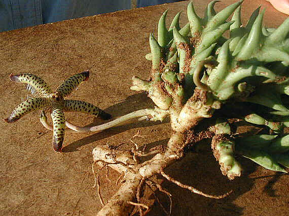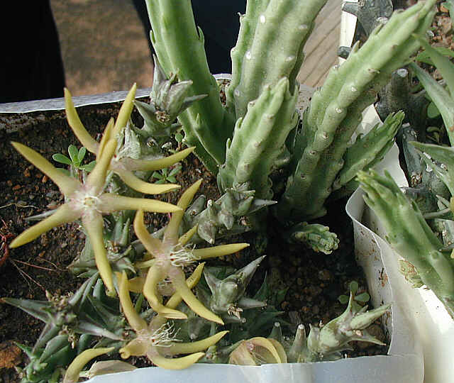 I was surprised when I went to a Heads of Division meeting on 23 Feb. and was told that I was on leave. I knew that my contract ended on 5 Feb., but I assumed I would keep working until I had my benefits as in the past. Although I argued that I couldn’t leave without money or an air ticket, I was told I was on unpaid leave until I started a new contract. So I am in limbo. On Jamie's birthday (9th March) I finally got the money owed to me, so we can afford a visit to Calif., but I'm still trying to get the plane ticket which is part of the contract. I applied for both the money and plane ticket on 24 Dec., the day I was promised a new contract! I now have a new contract, but I need the home leave before starting it. If you enjoy bureaucracy, Botswana is the place for you. Meanwhile, I am writing papers and continuing research as well as enjoying other activities. One joyful bit of research news is that an Orbea which I collected in January near the Tswapong Hills bloomed and turned out to be a hybrid with Orbea rogesrsii as one parent. I had no idea what the other parent could be until Queen Turner, head of the herbarium came back from the same area on the 13th of March with a blooming Orbea that is almost certainly the other parent. Unfortunately it does not match anything known in Botswana. I have sent a picture to Pretoria for help. It has been identified as Orbea maculata and there is already a specimen in Pretoria from Botswana. On Sunday 7th March we went on a walk south of town with the bird club. It was led by Jo Tayler who teaches mycology (fungi) at the university. It was a great day for fungus as we have had more than the average rain in the last month. Among those seen were little birds nest fungi which look like tiny eggs in a cup. We also saw lots of birds and Polly even found Stapelia gigantea in bud. Unfortunately, a lot of tiny "seed" ticks found us in the high grass. Polly managed to get dozens, while I only had a few. We picked them off, but they left inflamed spots. Polly treated some with hydrocortisone and some (at my suggestion) with juice from Bulbine frutescens (a South African species common in gardens here). Unfortunately the hydrocortisone worked better. The Bird Club also had a BBQ on the 19th with hilarious accounts from people who actually admitted getting lost. (Most of us pretend that never happens.) We also went to see Spy Kids III (a lousy movie) because it was the first 3-D movie in Botswana. Both of us had trouble with the 3-D (the old red and green glasses kind). Polly was born cross-eyed and is virtually one-eyed. I have two good eyes now, but the images are not vertically aligned, a problem I've always had. With effort I can get the images to converge, but during the 3-D movie they kept splitting. I'm told I can get prismatic lenses to correct this.. I have been acknowledged as a contributor on a new book on the Commiphoras (all I did was send distribution maps for Botswana). It is Southern Africa Commiphora by Marthinus Steyn (2003, by the author, Arcadia, South Africa). I don't know the price as my copy was free. Each species is well illustrated with pictures of the tree, the flower, the fruit and the leaf. There is also a distribution map for each. For those not familiar with this genus, it is the genus which includes Myrrh of Biblical fame. It is in the Burseraceae which includes the elephant trees (Bursera species) of North America. |
