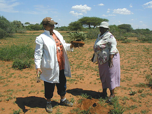 ![]() Queen Turner holding Brachystelma foetidum plus our guide, Rachel Ditlhabe at Hebron, 30 Dec 2004 |