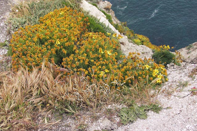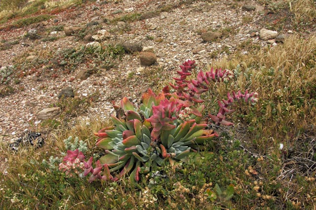 My sister Karen and her husband arrived on 23rd April from Yosemite where they were very cold. Our son John arrived early on 25th April from a trip to the Grand Canyon where it was very cold. That afternoon we had a birthday dinner at Anne’s for Alice who was 93 on the 29th. Anne supplied a candle which opened with fireworks and then sang Happy Birthday endlessly. Afterwards we went to the last of the Community Concert series, “Abba-Mania”. Polly and I got up early on the 27th and drove John to Ventura where we caught a 9 o’clock boat to Santa Cruz Island which is part of the Channel Islands National Park. Polly had been to Anacapa on a high school trip and we both had been to Catalina (courtesy of Anne’s husband, Wayne, who flew us out there just before John was born.) Neither of us had been to the other islands, although I could see them from UCSB when I studied there. This was a birthday treat from John. While waiting, I bought a book, Chumash Ethnobotany, Jan Timbrook, 2007, Heyday Books, Berkeley. The Chumash are the Native Americans who occupied the Channel Islands and nearby coastal areas. They painted fantastic artworks on rocks, presumably with the influence of Jimson weed. Ethnobotany covers the uses of plants and I find parallels with African plant use interesting. The book has some color paintings, but most plants are unillustrated and none are described. On our short turn through the harbor, we saw harbor seals, pelicans and cormorants. As we left the harbor there were California sea lions clustered on a buoy. The highlight of the boat trip was the dozens of dolphins which cavorted in the wake. I have never seen so many. There were even some young ones. We passed between oil platforms and I was reminded of the tar on the UCSB beach. John, of course, was reminded of the two years he spent as an oil platform diver in the Gulf of Mexico. Earlier Lora had taken John and me out on a fishing trip from Santa Barbara and we found the best place was near an oil platform. We landed at Scorpion Ranch and were lead on a tour by a volunteer, Kathy van Slyke. We started at the Ranch house where there is a small visitors’ center. An orange crowned warbler greeted us during the lecture. Next we proceeded to a campground where we learned about a number of plants such as the Island Ironwood which is found only on Santa Cruz and Santa Rosa Islands. Because of its strength it was used for harpoons, canoe paddles, abalone pry bars etc. Just at the edge of the campground we were entertained by a pair of Island Foxes which have recovered from their threatened status. John got some excellent pictures. (He moonlights as a photographer.) Next I found an island western fence lizard. My pictures show more cheese weed than lizard as he was quite shy. Proceeding uphill we found a prickly pear (there are two plus a cholla natural to the island), were shown some diatomaceous earth (most of the island is volcanic) and some ground dwelling bees. Just at the edge of the cliff we reached a Chumash shell midden. One of the industries on the island was the production of shell money. The steep cliff going down to the sea was covered in giant Coreopsis, a succulent daisy. Unfortunately most of them were past blooming. At the top there were South African mesembs which have invaded the islands. Some were in full bloom. This was the end of our tour, but I asked Kathy if she knew where the Dudleyas were. She didn’t, but suggested hiking out to Potato Harbor. She and Polly started back and John and I set off to find Dudleyas. We had barely started when we found plenty – unfortunately only in bud. After taking a number of pictures, we headed back and caught up with Polly and Kathy. We had a brief look in the visitors’ center where they had a model of a rare Dudleya which is on the far eastern tip of the island. It doesn’t look like a Dudleya and I wasn’t surprised to find that some experts put it in a separate genus Hasseanthus. We had an hour to kill before the boat left and visited the cliffs near the dock. There were more Dudleyas there as well as succulent Senecios (another daisy) and Chenopodiums. John got great crab pictures and I got some of an oyster catcher. Someone had picked a fruit of a man root. This prickly cucumber looks like a green sea urchin. (The real sea urchins were purple.) John had booked a scuba trip to Anacapa for the next day, but the wind came up and all boats were cancelled. We took him up to Santa Barbara where he caught the train back to Sacramento. Polly and I went to Ojai and bought plants at Desert Images (the Calandrinas, a giant Portulaca relative, are spectacular) and then stopped at Piru but found the nursery there was closed. All their plants were huge so I probably didn’t need them anyway. South of the grapevine there were poppies, lupines etc. in bloom. We made it back just before the storm that closed the Grapevine that night. (Anne reports the wildflowers survived as she passed that way shortly thereafter.) Those of us in Bakersfield celebrated Mother’s actual birthday with breakfast at Denny’s (free on your birthday!) and dinner at Sizzler at the Ice House. On the 2nd of May we went to Red Lobster for Anne’s birthday. On the 6th (her actual birthday) we had breakfast at Denny’s and then went to Fresno for the Cactus meeting. John Matthews spoke on Haworthias. Like the similar talk in Bakersfield, he had lots of plants. Instead of just holding them up, however, he passed them around. It was impossible to look at one plant and listen to him talk about another. People began talking among themselves and it was chaotic. To understand the Dudleyas on Santa Cruz Island, I checked out Dudleyas and Hasseanthus by Paul H. Thomson (1993, Bonsall Pubs., Bonsall, CA) from the Fresno club library. At first glance it looked good: distribution maps, pictures, descriptions, keys etc. But it has some major faults. There are no synonyms listed, so it is impossible 