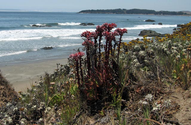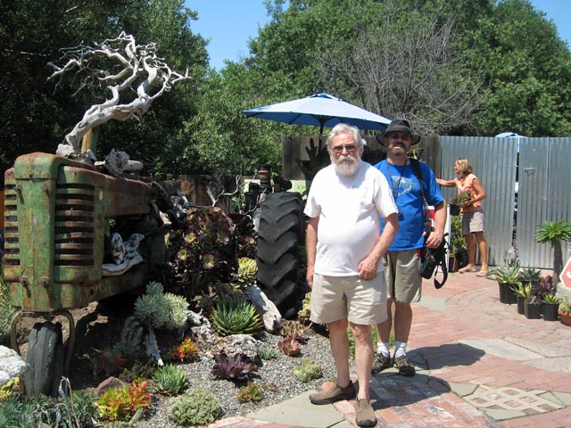 On 23 June we went to an organ concert at the 1st Presbyterian Church. Hector Olivera from Argentina gave a long recital that used every note on the organ there. (This was a pre-convention concert of the American Guild of Organists.) On the 26th we heard Robert Ampt and Amy Johansen at the Olive Drive Church. This Australian couple was easier on the ears as they didn’t try to give all the extremes of volume possible. Alice went with us on this one and enjoyed it tremendously.xz On the 2nd of July we set off for the coast with John. Our first stop was Cholame for breakfast. We were pleased to note that they are busy widening “blood alley” (46) from there on west. Eventually we reached Cambria and Grow Gardens. We were pleased to find that in addition to the fantastic succulents, they sell unusual minerals. Polly bought an ammonite from Germany where the shell had been replaced by fool’s gold (iron pyrite). I bought a piece of Botswana agate to add to the collection I already have. John bought a red barrel cactus. xz Nick was not there, so we proceeded up the coast to the elephant seals north of San Simeon. It is amazing to see so many of them so far south. (Years ago we had seen them at Ano Nuevo where we had to have an appointment.) Now they are visible from the parking lot with no waiting. Most of them were lined up on the edge of the wet sand just basking in the sun. Occasionally a couple of big bulls would commence burping and hitting each other, but in general it was quite peaceful.xz I had spotted some Dudleyas just south of there, so we pulled off into another lot and I got some good pictures of the red flowers. A couple of women had scopes and an antenna aimed out at the water so John asked what they were doing. They were monitoring sea otters which are another endangered species making a comeback. There was also a woman feeding squirrels despite signs warning against them.xz I had noted some tall dragon trees back at San Simeon so we made another stop to photograph them. It was lunch time and they were in front of a Mexican Restaurant called El Chorlito (shore birds), so we checked it out. It has a fantastic garden of succulents and we watched humming birds, other birds, butterflies and bees while we ate a rather good lunch. Our next stop was to photograph the zebra and cattle grazing together. (We did not go to Hearst’s Castle. Polly and I had been there on our honeymoon back in 1964.)xz Our next stop was Morro Bay where we watched a giant chess match. We then wandered over to the docks and talked to a fisherman who was just bringing in a catch of eels which will go to Korea. He complained bitterly about reserves which have fish owned by “nobody”. I tried to explain that these reserves “feed” the fish supplies in surrounding waters, but he was not convinced, even though he admitted some areas had been over fished.xz Polly insisted on driving out to Morro rock, which we found rather uninteresting. (Gone are the days when climbing was allowed. I remember my father going out on the seaward side where I later learned peregrine falcons were breeding.) The biggest surprise came as we started back. We found six sea otters with babies floating in the bay! (There was a lone one (male?) zipping around further out. John got a good video of the babies being groomed. (He only regretted that he hadn’t brought his best lens!)xz Next we stopped at the San Luis Obispo botanic garden. They have laid out the garden with plants from all winter rainfall areas. The aloes in the South African section were blooming. There was also a Puya from Chile which had bright blue-green flowers and orange stamens. I was interested in this because there is a rumor on the internet that there is a sheep eating plant. It turns out this is the large pineapple relative Puya chilensis which has nasty thorns on the leaves which catch in wool. They do not eat the sheep.xz We had dinner at the Quarterdeck Seafood Restaurant in Arroyo Grande. This is not a town noted for seafood, but it’s a lot cheaper than eating on the coast. They had a beautiful tank of sea creatures, including a sea cucumber. That night we stayed at the Arroyo Grande Village Inn which John had booked on the internet. A long, but satisfying day!xz Next morning, the 3rd, we had breakfast at the Arroyo Grande Café and walked around the “Village”, a historic section of town. We then drove west on 41, stopping to pick up serpentine and observe yuccas. Returning to Cambria, we found Dudleyas in bloom at the south end of town. They looked more like the ones on the Feather River Canyon, rather than those of San Simeon. Nick had been to Grow, but had already left when we arrived. I bought a small Euphorbia pachypoidioides. I had seen one on display at the Huntington, but this was the first time I had seen them for sale.xz Leaving Cambria we followed a pie shop sign hoping to find lunch. We ended up winding on a mountain road (Santa Rosa Creek) for miles and never found a pie shop. Instead we found flocks of turkeys and a deer. It’s good to see land animals are thriving too. We eventually had lunch at Jack in the Box in Paso Robles. After lunch we went to the pier at Point San Luis in Avila and watched sea lions, seals and red footed storm petrels. From there we made our way to San Luis Obispo and had dinner at the Thai Boat, a restaurant with good but very spicy food. We spent the night at the Super 8 Hotel which John had booked.xz We had intended to go to Fresno on the 4th, but the annual potluck picnic was canceled due to the excess heat. Instead we had breakfast at the hotel and took 227 as the scenic route to Arroyo Grande. In Carpenter Canyon just north of AG we saw a series of potted plants hung zigzag on a pole with a label saying plants for sale. It was self serve. I bought a Calendula and John got a pencil-leaved Cotyledon.xz In AG we found the swinging bridge across the arroyo which we had missed before. There were signs in